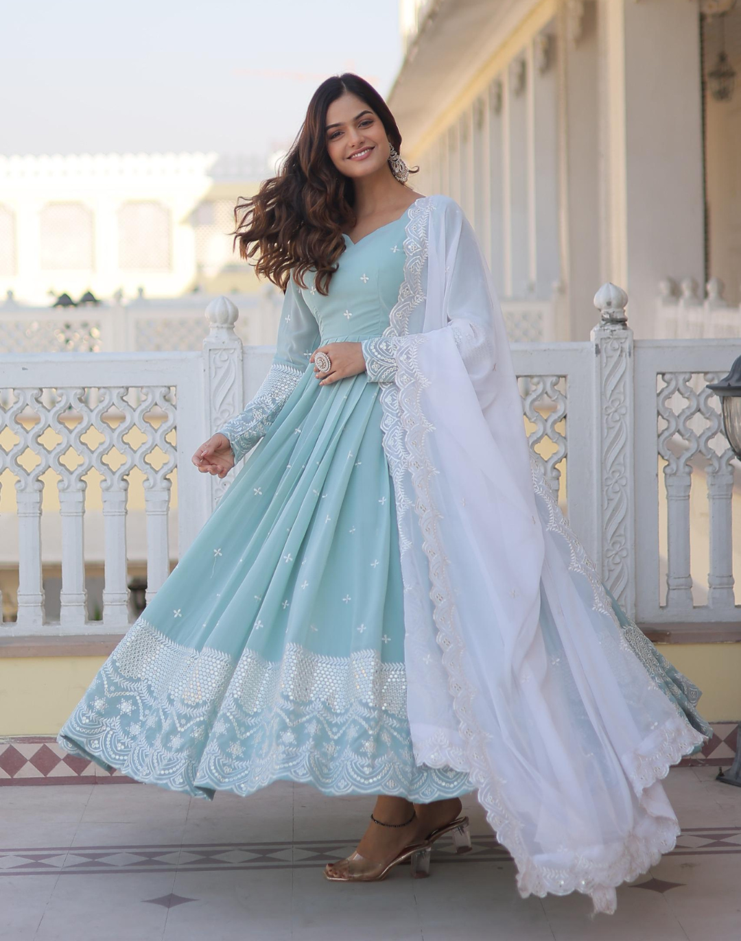 Premium Designer Thread & Sequins Embroidered Gown with Cutwork Dupatta
