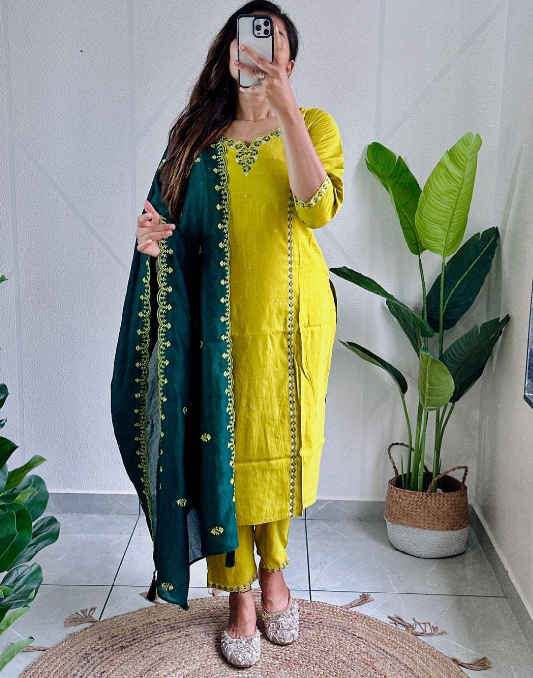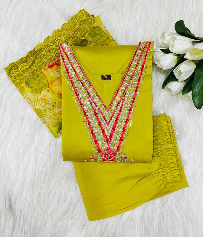 Elegant Roman Silk Kurti Palazzo Dupatta Set with Zari & Latkan Work