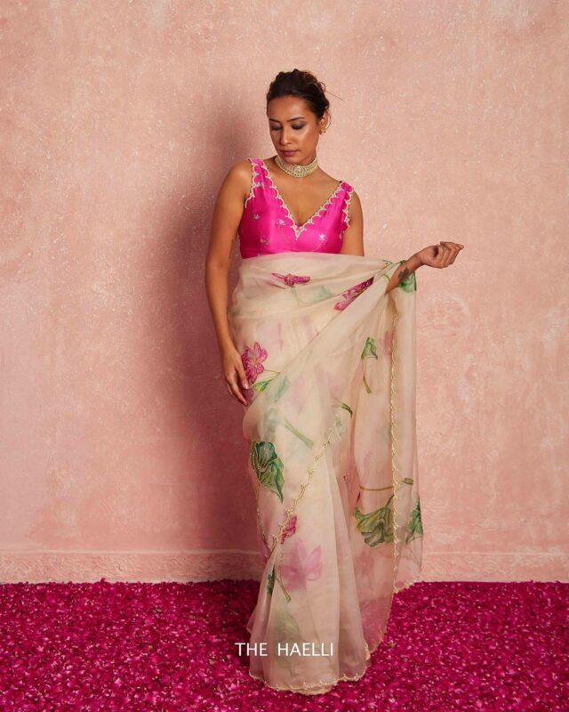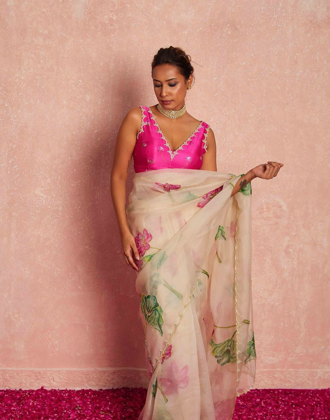 Premium Organza Teby Silk Saree – Floral Prints & Hand Khatli Work