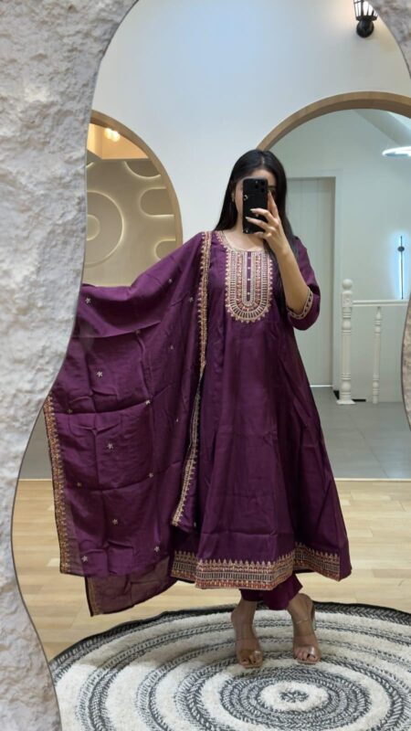 Elegant Roman Silk 3-Piece Anarkali Suit Set | Embroidered Gown with Dupatta & Pant | Full Stitched | Party Wear