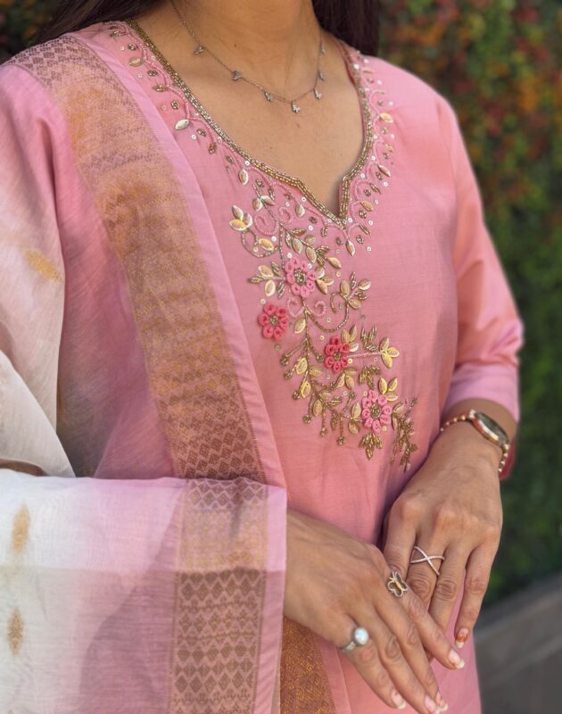 Yugal Loom Premium Roman Silk Kurti Pant Dupatta Set – Light Pink | Hand Work | Chanderi Dupatta