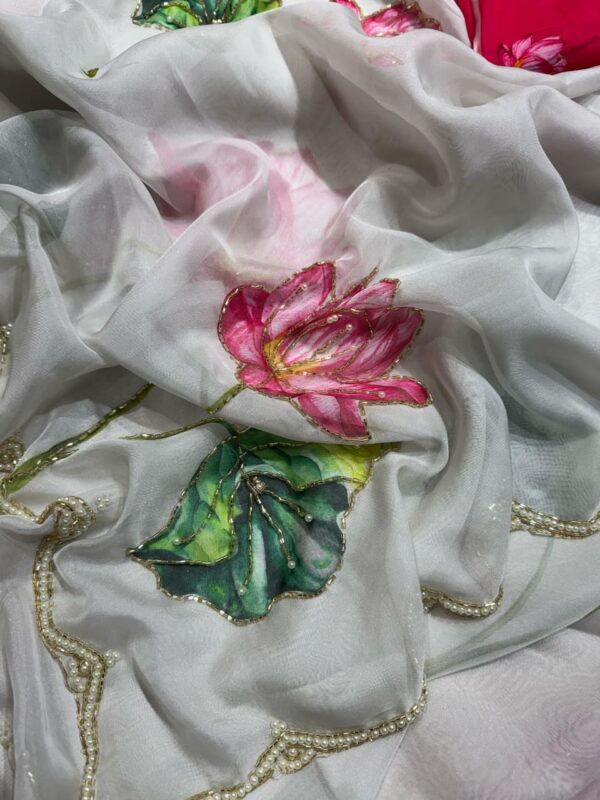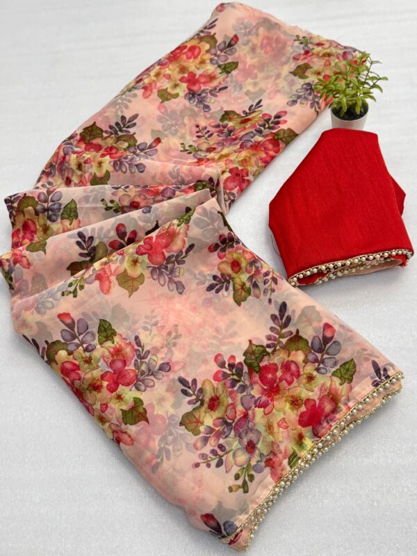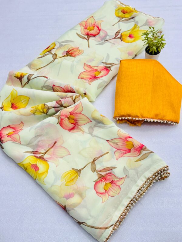 Floral Digital Print Soft Chiffon Saree with Handwork Moti Lace