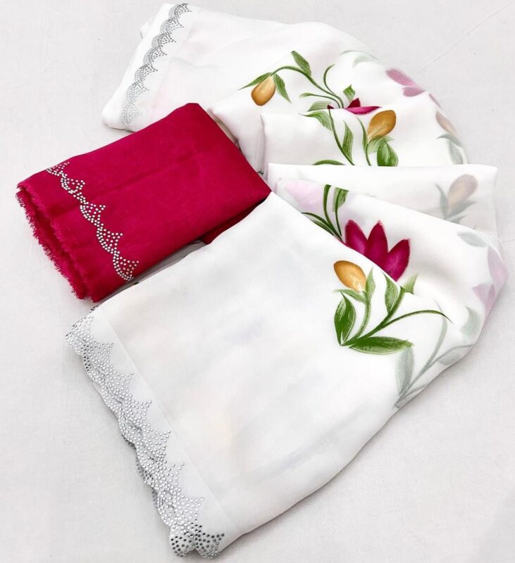 Soft Georgette Saree with Lotus Handbrush Print and Siroski Cutwork Border